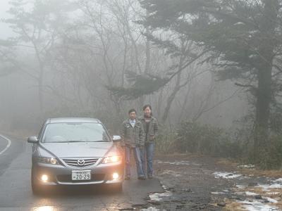 1月とあって結構参拝客はひっきりなし。 参拝中に小雨がぽつぽつと・・・・・ 車に戻った頃には本降りに。 また止むだろうと思いきや、霧まで出てきて止む気配は無し。 高千穂河原に着いた頃は視界20メートル。 本来なら、ここでプチ山登りを体験してもらうつもりだったけど、断念。 霧の中をドライブに切り替えて走る。