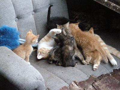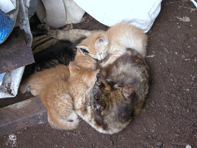 20日には日帰りで葬儀に参加してきます。 ここで怒りを伴った疑問が。 肺がん防止のために禁煙して10数年たって、肺がんで亡くなる。 いったい何の為の禁煙だったのか。 マツケンは今でも喫煙を続けているが、吸うべきかやめるべきか、 いろいろ悩みながら一服する。アタシってふとどき者? 今日も雨、じとじとの雨。全ての者をかび臭くする雨。 せめて心まではカビを生やさぬように・・・あ、毛は生えてるかも 先日も紹介した弊社の野良猫たち。その育児って驚きです。