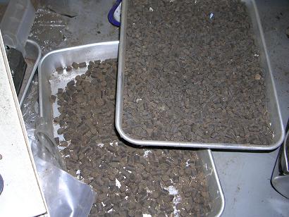 冒頭の画像は24日に研修に行ってきた、九州沖縄農業試験場内の堆肥ペレット化施設で 出来ていた牛糞ペレット。マツケンの会社ではお客様のご要望第1位がこのペレット化。 ペレットにすると①機械散布が容易に出来る。②容積が減るから運搬がラク。 ③作物に合わせて各種有機物を混合し易い。などのメリットがあります。 ええ、分かってますとも。分かっちゃいるけど、その機械が馬鹿高ですがね。 1時間処理で800キロの能力がある機械で、本体のみで800万円!! 粉砕機、振動篩い機、岩石選別黄など一式だと1500万円は下らない。 しかも本体内に在るステンレスメッシュが1枚30万円!! 電力は30キロ超え。う~ん、すッごい経費だけどこれって儲かるの? ま、今後の検討課題ってことで困ったことは先送りっと。