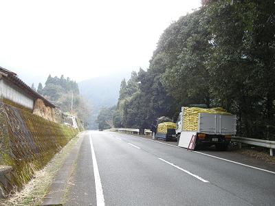ここで待機。この後、軽トラックがわらわらと集まり、みんなでわっせわっせと荷卸。 あっという間に450袋がそれぞれの場所に。 この道を登って行くと、あの五木村。