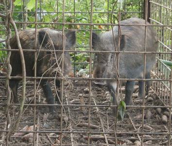 早速猟師さん達が登場。 すぐに殺すのではなく、しばらく飼育して大きくなったら・・・・ ま、少しは生きられるのだから、ヨシとするか。 野生動物と、人間の争い。昔のように森が豊かならここまでしなくて良いのだろうに。