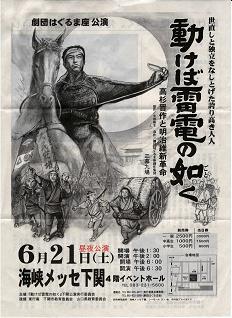 「動けば雷電の如く 高杉晋作と明治維新革命」 一見の価値あり。劇団より感想を書いてくれと依頼されたので、急遽作成したのがこれ。 「動けば雷電の如く」感想 鹿児島県薩摩川内市 松山健郎 6月21日下関にて を見せていただいた。前作を2回見た上での今回の改作劇第1回目公演。劇団創作集団が今後の劇団運営命運を左右すべく全身全霊で作り上げたと聞き及び、いやが上でも期待が高まる。 折からの大雨にも関わらず満席の会場。聞けば昼の部は立ち見もあったとか。観客が固唾を呑んで見守る中、はらわたに響く重低音の大太鼓に続き弥市役説明後いよいよ幕が開く。 まず感心するのが背景その他道具類のリアル感と美しさ。こういったところにも相当力を入れてきたことが分かる。役者の熱演もあり、前田砲台修復の場面から終幕まであっという間に時間が過ぎた。観客が場面と共に劇中に吸い込まれるように集中していくのが客席の中にいてよく分かった。期待通り、いやそれ以上の台本内容と熱演、堪能させていただいた。今回の劇は全編を通じて百姓町民が主役と感じる。何時の時代も(現代においても)農家や規模の小さい商家はその仕事の重要性を認識されることなく、時の権力者に蹂躙される。高杉晋作は人民の中にふつふつと湧き上がり続ける「怒り」と「怨み」の力を引き出し、死を恐れぬ人民武装組織をつくり、その卓抜した先見性と指導力で維新を成し遂げたことがよく理解できる。何より諸隊諭示に有るように(農事の妨げをせず・・・・) 国家の基は農にあり、それを踏み荒らして何が改革かと平成の権力者たちにも是非聞かせたい部分である。 もう一点私が重要としたいところは、以前の感想文にも記したが「高杉様にとっての攘夷とは」という部分。私の拡大解釈であることを認識した上で、この部分は現代に送られた最大最高のメッセージだと思う。農業部門からいうと、現在の通商条約(WTO,FTA等)は不平等条約の最たる物。輸入国には開放を共用しながら、いざ自国が不作あるいは品不足となれば簡単に輸出制限する。「出さない権利」が有るのと同様に「入れない権利」が有ってこそ平等条約。まずは攘夷、その後平等な立場で開国。140年前のこの思想こそ、これからの農政に生かさなければなるまい。 さらに今回の劇では人間高杉の苦悩も取り入れられており、それによって益々劇の厚みが増してきているように感じた。「親を捨て子を捨つる・・・」逆臣となることで家族はもとより親族まで類が及んだかの時代で、逡巡しないはずが無い。自己の煩悩を打ち破って決起した高杉が見事に表現されていた。 前作では難解な部分も有ったが、新作では平易にしながら軽くならないようになっており、低年齢から熟年まで世代を超えて理解し易く万民に受け入れられる劇となっている。 劇団の運営自体も大改革をしていると聞いている。この劇にかける意気込みはしっかりと伝わってくる。是非全国津々浦々まで維新の雷鳴をとどろかせて欲しい。日本という瑞穂の国が本来の姿に立ち返って、世界に誇れる真の独立国家となるよう劇団はぐるま座の今後の活躍に期待する。 熱い、熱いね~ ご招待受けたので、感想ぐらいかかなきゃね。これから全国を公演して回るとの事。 是非たくさんの人に見てもらいたい、そして何かを感じて欲しい。う~ん、熱いぞ。 PR この記事にコメントする