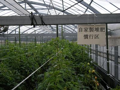 自家製堆肥区(夢ゆうき21」)と農大堆肥区に分けて、更に慣行栽培と遮根シート区に分けて試験中。 様々なデータを取りつつ、栽培の実習を行う、結構専門的な大学です。 学生1人1人が圃場やハウスを自分で管理し、技術を学ぶ。 近い将来の農業後継者や技術者を育てる為の、ハイレベルな教育がなされている。 その中で、様々な失敗や苦労をしながら、学生たちは成長をしていきます。 拙者の次男も初めてのトマト栽培で、基本的なミスを数々経験。 しかしそれが次の栽培に役立てば良いんです。 そんな中で、弊社の製品と、農大堆肥の決定的違いの一端が判明。