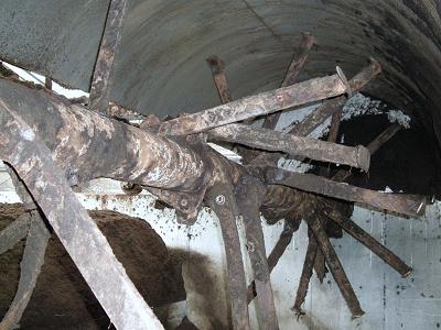 案の定、攪拌羽の変形、脱落多数。 こりゃー困った。 原因は、農家さんが持ち込む生堆肥中に大きな石が混入しているから。 この石に羽があたると、まず、ボルトが切れる。 以前の手入れで、このボルトを丈夫なステンレス製のしたのがまずかった。 ボルトが切れないと、羽が曲がるしかない。 結構高価な羽がグニャリでは、もう使えない。 ボルトなら何回でも交換できる。 んが、堆肥の中で長年頑張ったボルトは、錆付いてほぼ回せない。 んで、結局、ガスバーナーで焼き切り。どちらにしても手間がかかりますわい。 元々、石を混ぜて持ち込むのがけしからんのだが、どなたの堆肥中かが 特定できなくて、文句言えません。全般的にお願いするしかない。 その他にはこんな物が。